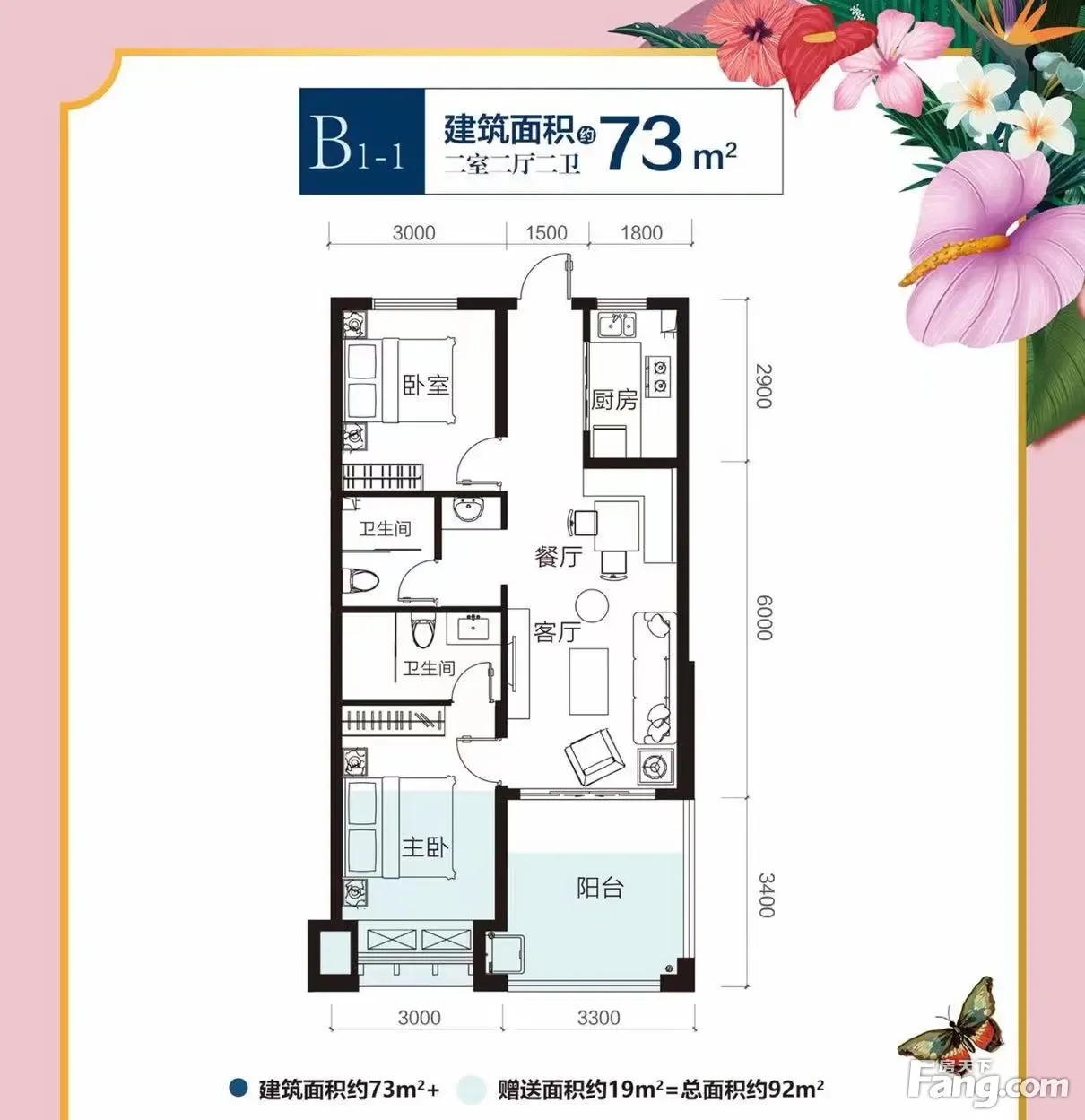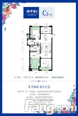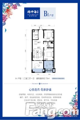 小郑为您解读户型: 73平米甜蜜两居,布局方正,分区明朗,尽显生活态度餐厅、客厅、阳台紧密衔接,空间开阔灵动 双卫配置,干湿分离,更安全、更干净,不失优雅 超大赠送面积,提高使用率,超值性价比