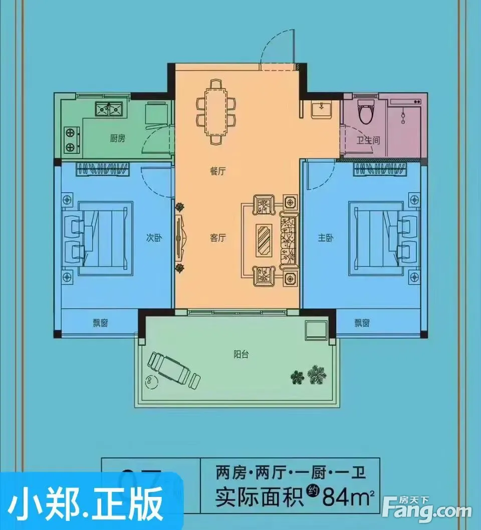 小郑为您解读户型: 76平米精装两房两厅一卫,餐客厅一体连接阳台,看小区美景,L型厨房,卧室连接阳台,洗手间干湿分离。