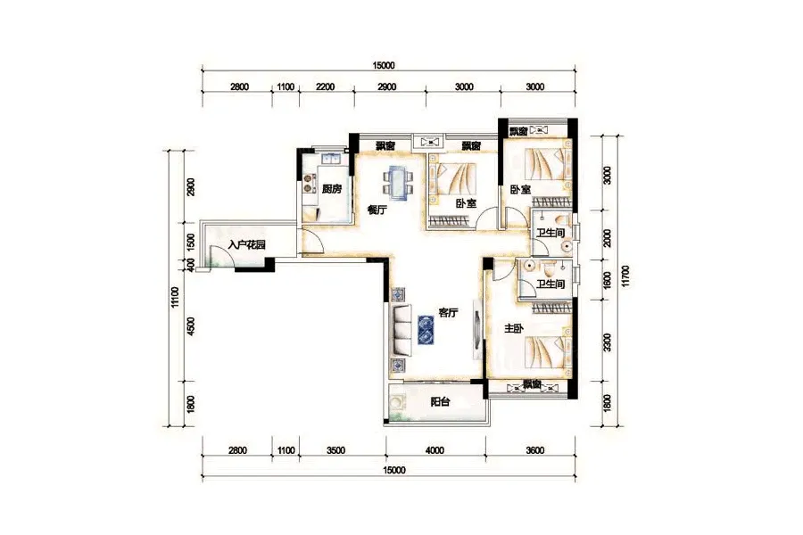 户型齐全,主打观景飘窗,带衣帽间,干湿分离二居