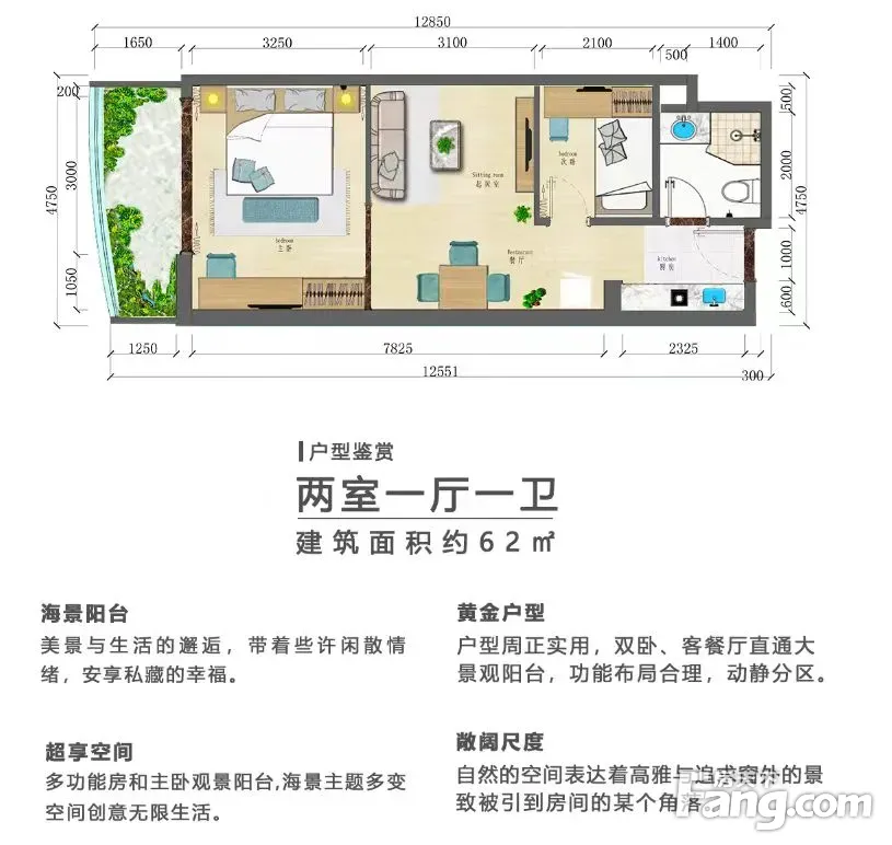 小郑为您解读户型:两室一厅一卫建筑面积约62㎡ 海景阳台 黄金户型 美景与生活的邂逅,带着些许闲散情 户型周正实用,双卧、客餐厅直通大 绪,安享私藏的幸福。 景观阳台,功能布局合理,动静分区。 超享空间 敞阔尺度 多功能房和主卧观景阳台,海景主题多变 自然的空间表达着高雅与追求窗外的景 空间创意无限生活。 致被引到房间的某个角落。