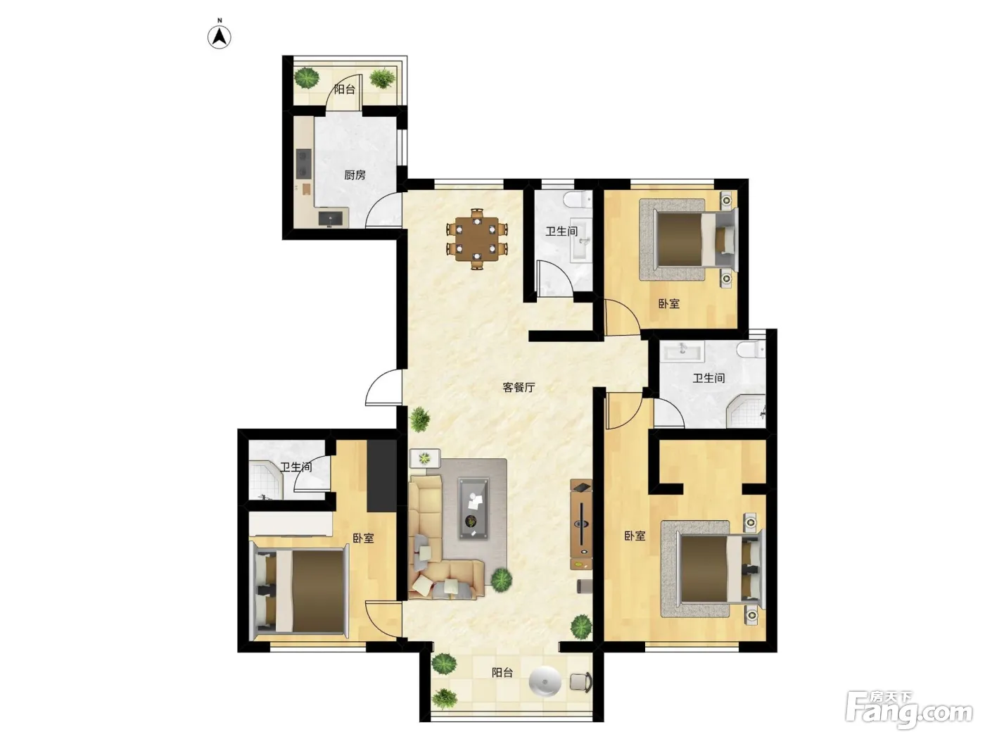 户型齐全,主打南北通透,全明格局,户型方正,采光充足,客厅朝南,厨卫不对门,明厨明卫,大面宽阳台三居