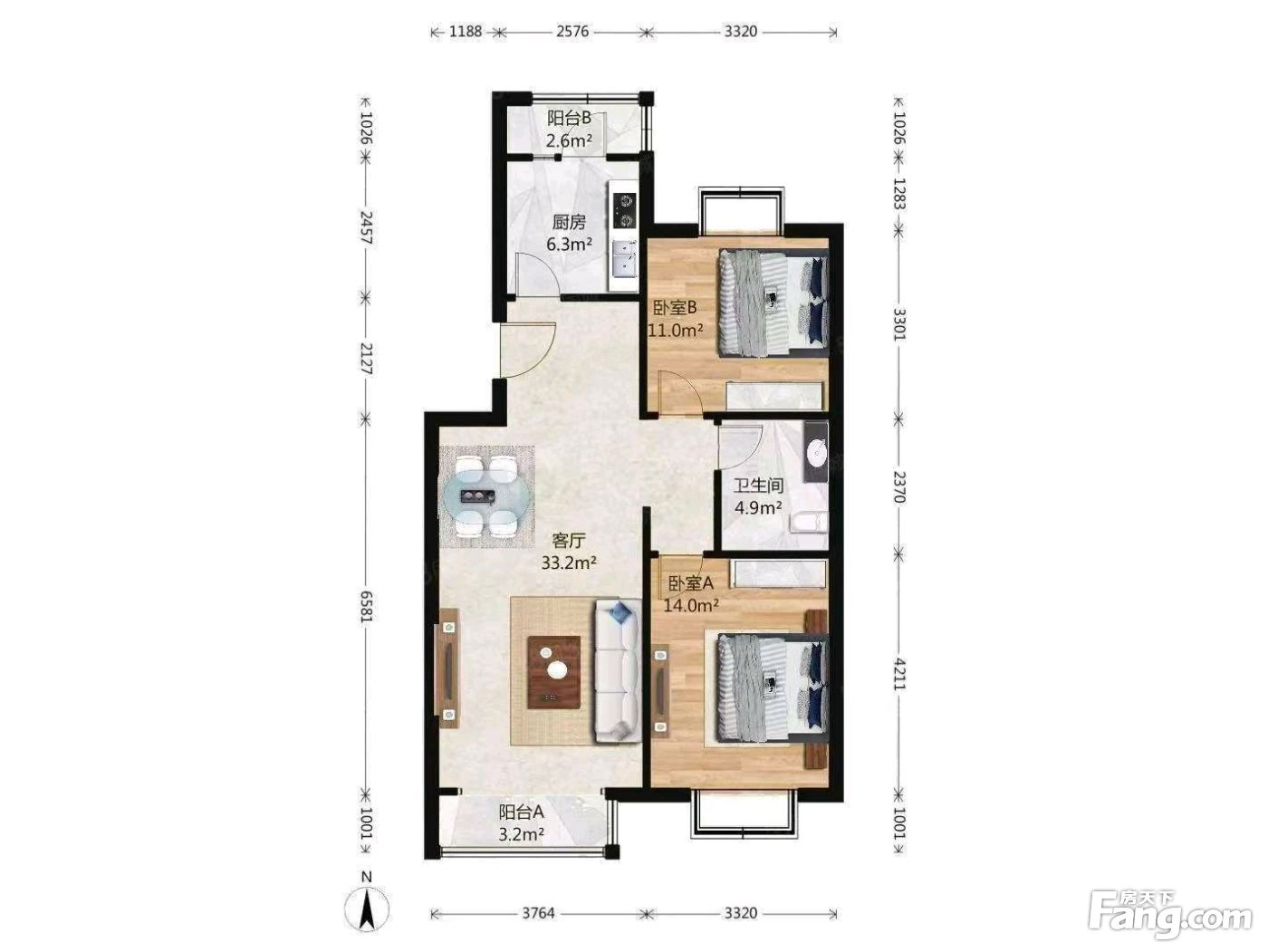户型齐全,主打客厅朝南,卧室朝南三居