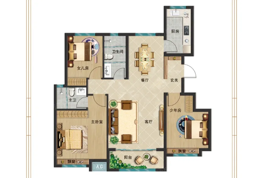 户型齐全,主打南北通透,全明格局,户型方正,采光充足,大面宽阳台三居