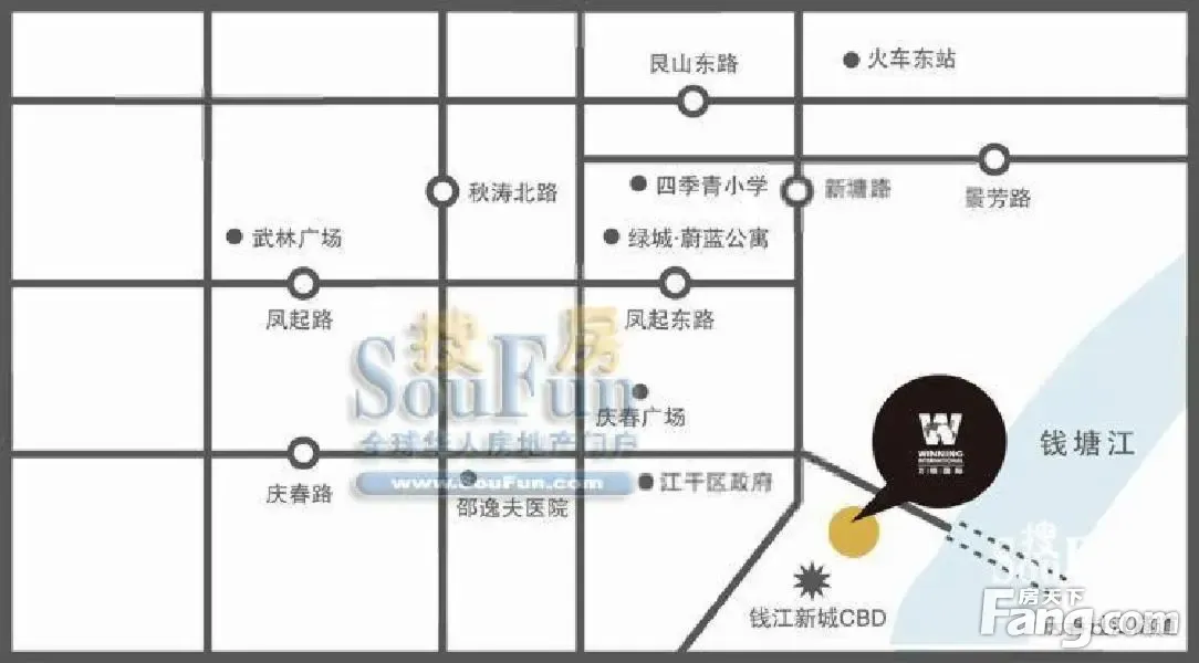 位于杭州市江干区,钱江新城CBD核心区域,4号线口,集办公、金融、贸易、信息、商业、旅游、居住等功能于一体。4号线整个贯穿区域,距离西湖风景区约4.5公里,杭州东高铁站7公里不到,抵达萧山国际机场仅18公里。
