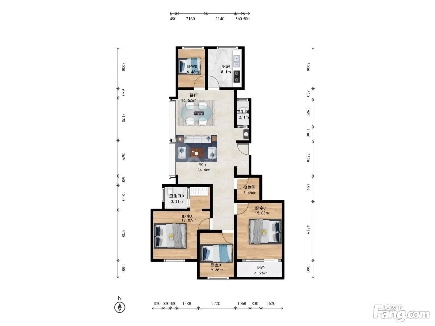 户型介绍:此房户型为4室2厅2卫,建筑面积为118.62平米,朝向为南。