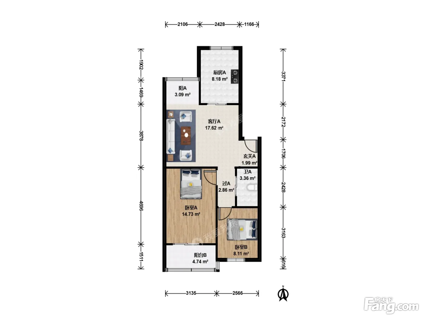 户型齐全,主打户型方正,明厨,客厅朝南,双阳台二居