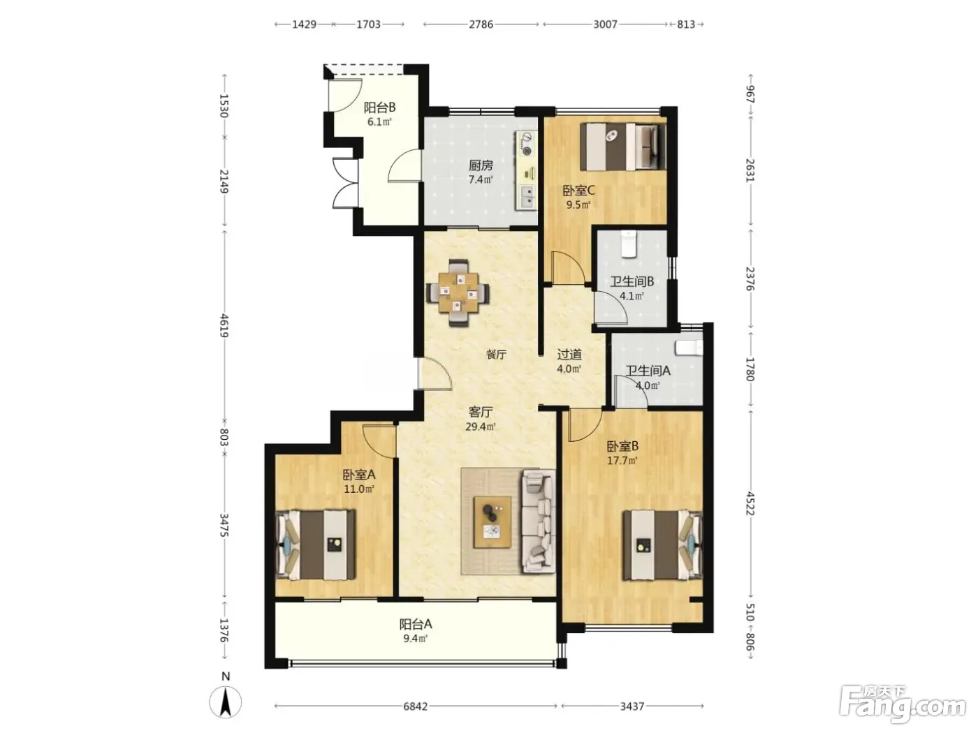 户型齐全,主打户型方正,客厅朝南,主卧朝南,U型厨房四居