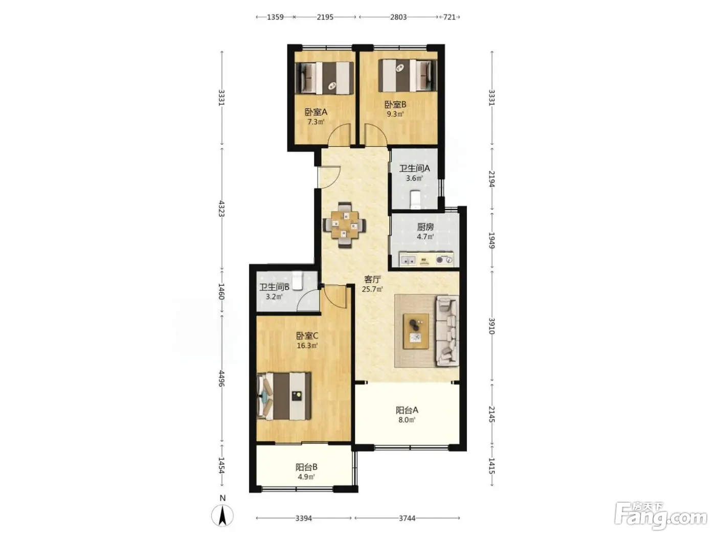 户型齐全,主打户型方正,明卫,明厨,客厅朝南,主卧朝南三居