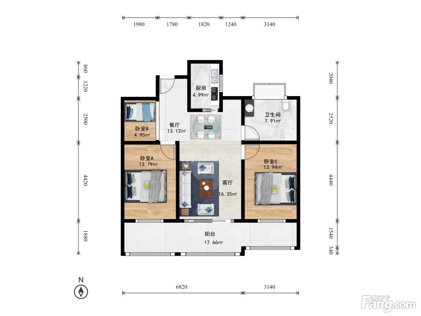 户型齐全,主打户型方正,明卫,明厨,客厅朝南,主卧朝南三居