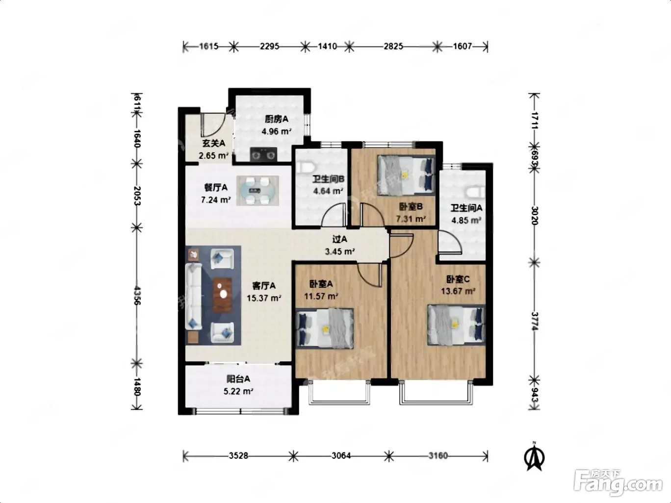 户型齐全,主打明卫,明厨,客厅朝南,主卧朝南三居