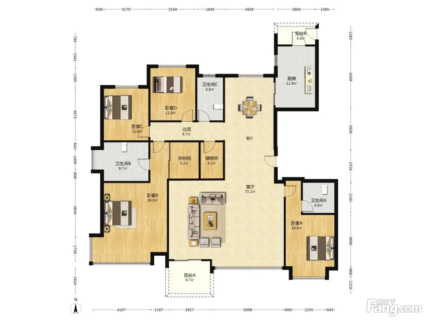 户型齐全,主打南北通透,全明格局,户型方正四居