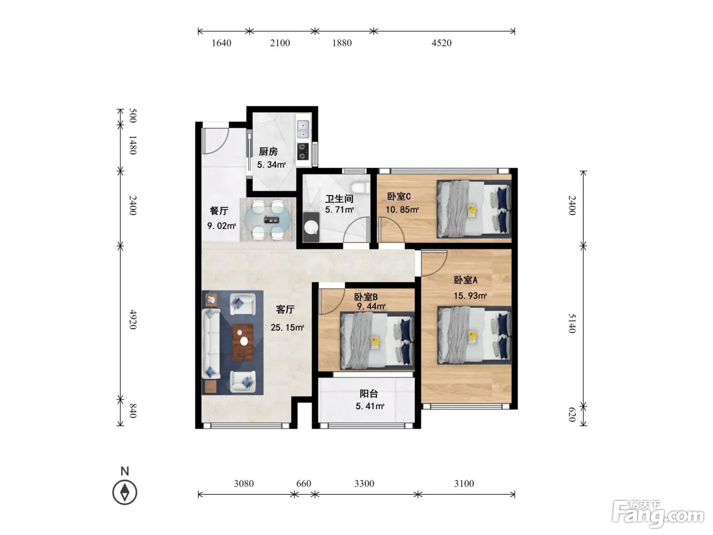 户型齐全,主打户型方正,明卫,明厨,客厅朝南,主卧朝南三居