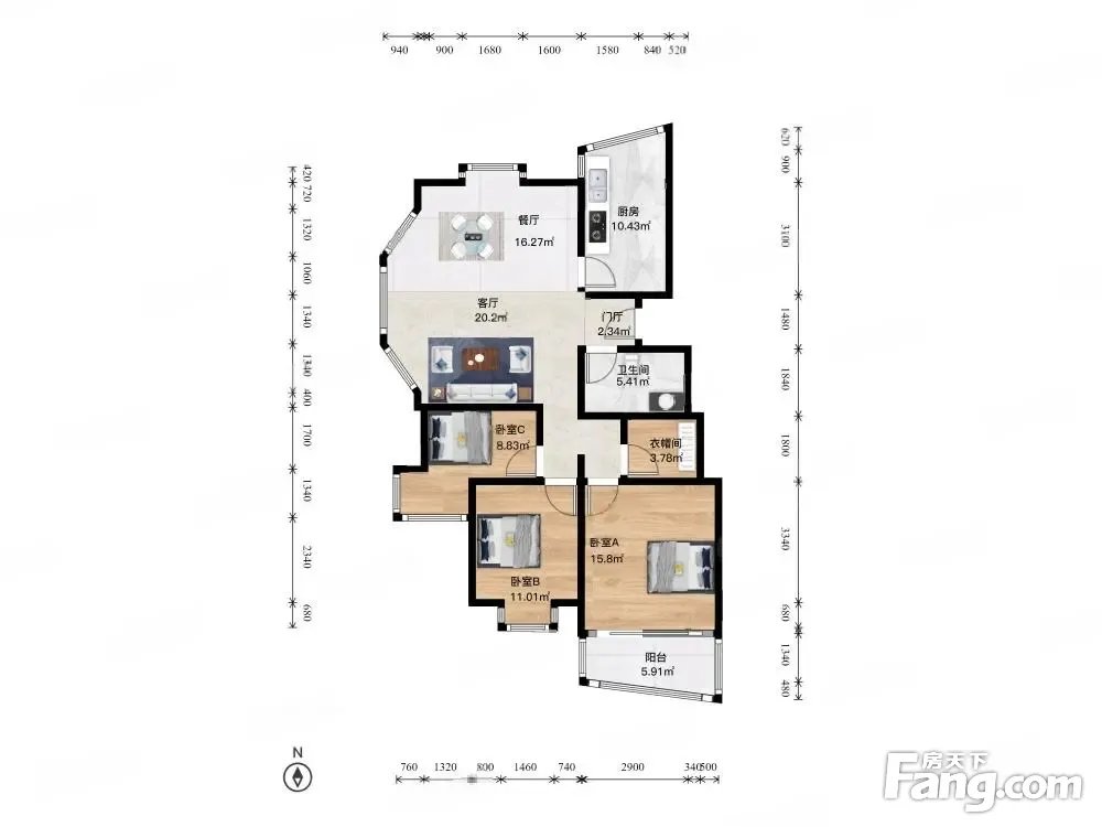 户型齐全,主打独立衣帽间,明厨三居