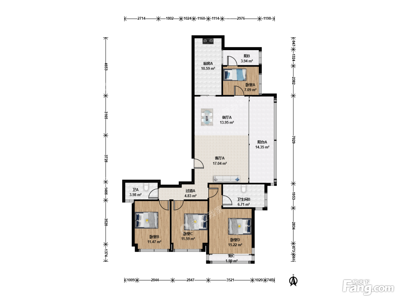 户型齐全,主打全明格局,采光充足,三开间朝南,U型厨房,双阳台四居