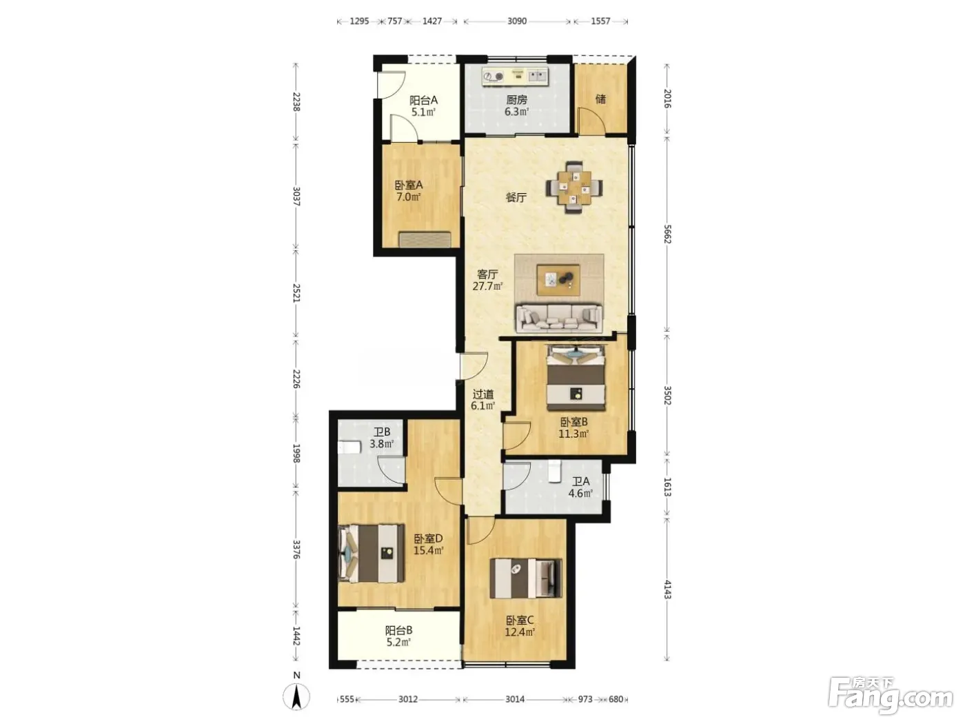 户型齐全,主打三开间朝南,餐客分离,大面宽阳台四居