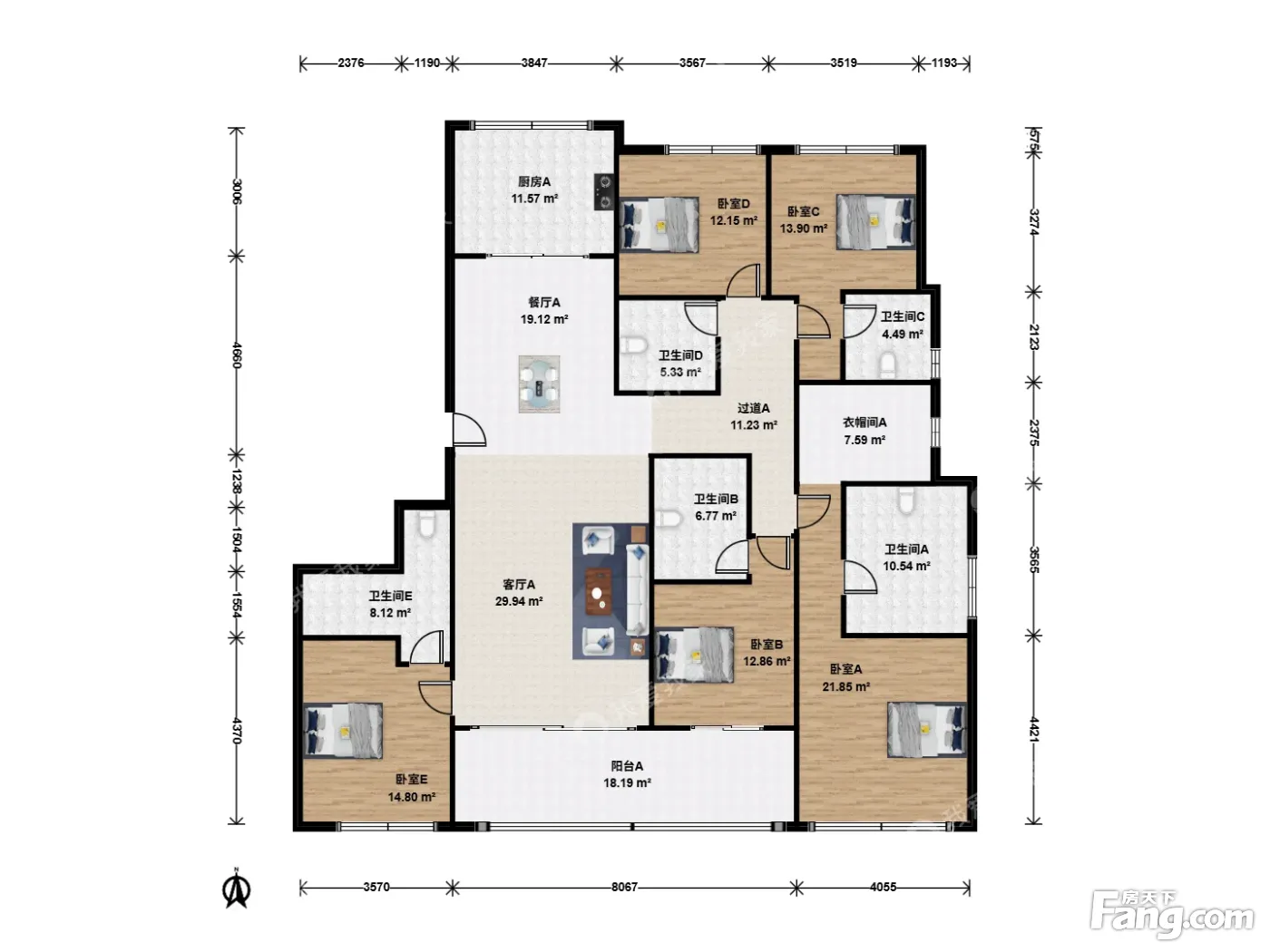户型介绍:此房户型为5室2厅4卫,建筑面积为235.01平米,朝向为南。