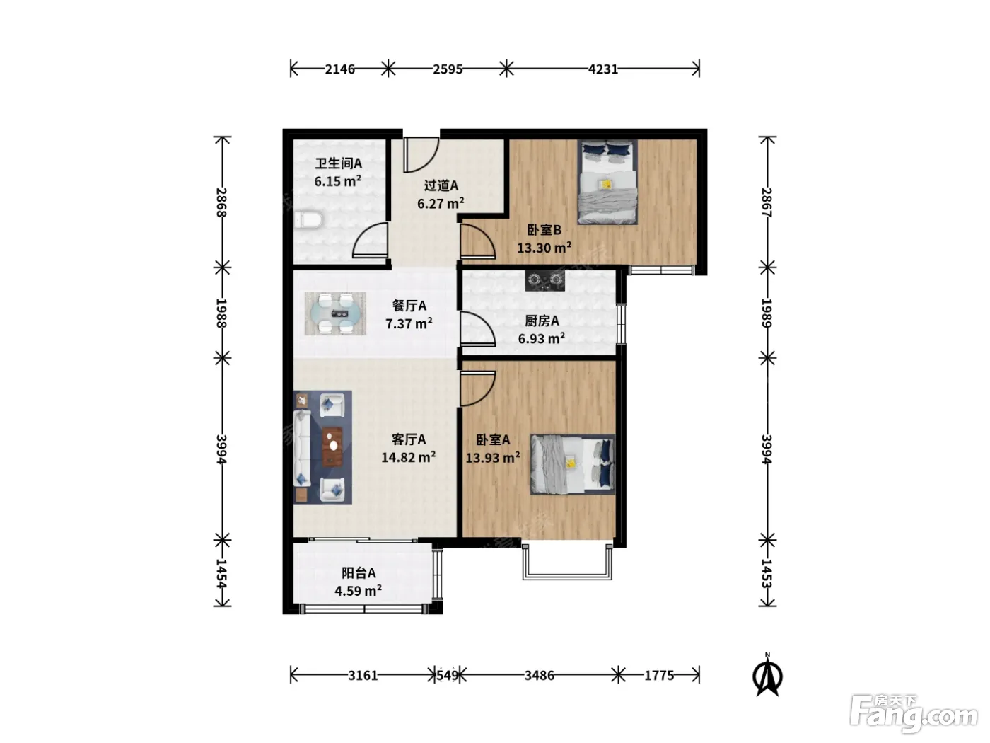 户型齐全,主打户型方正,明厨,主卧朝南二居