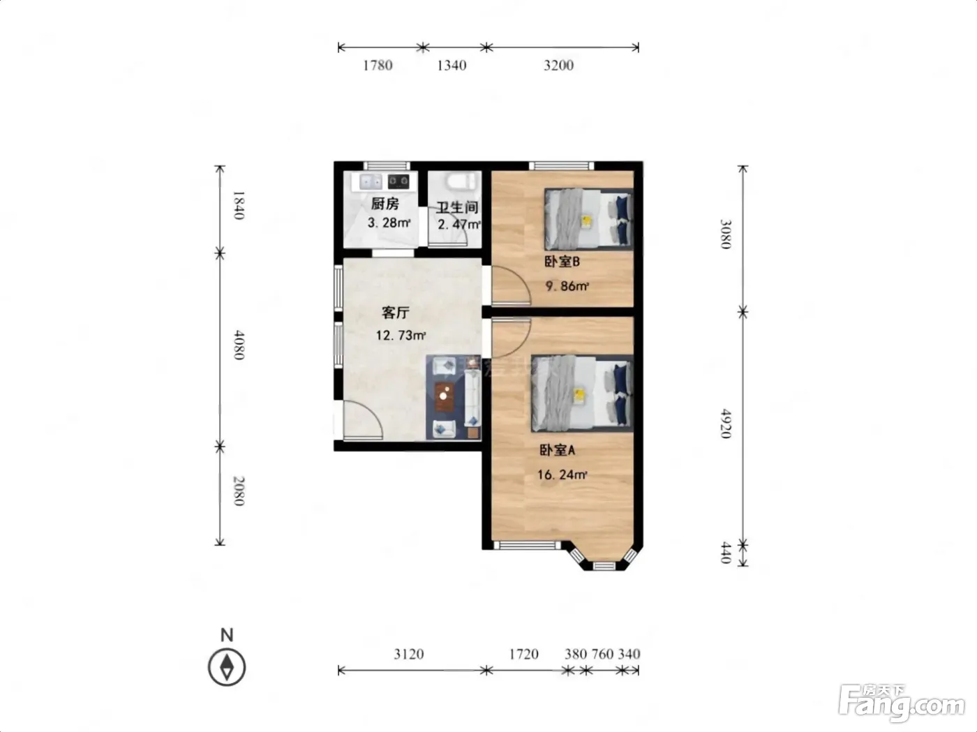 户型齐全,主打户型方正,明厨,客厅朝南,主卧朝南二居