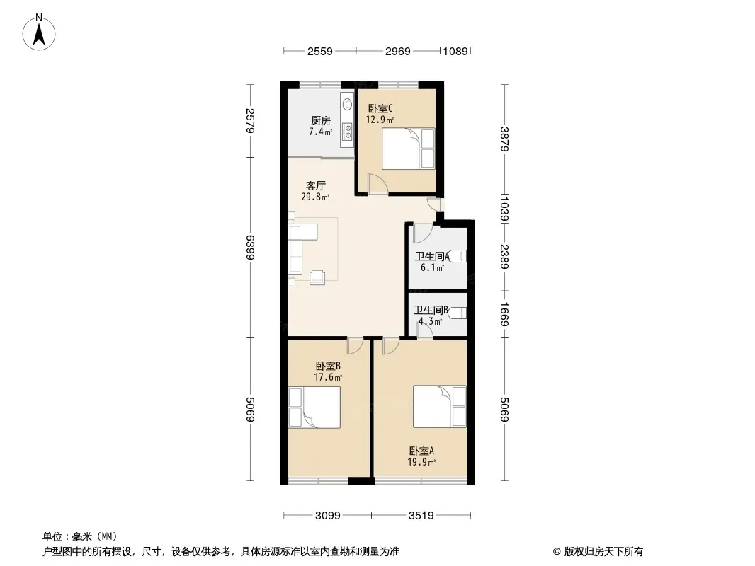 户型齐全,主打户型方正,明卫,明厨,主卧朝南三居