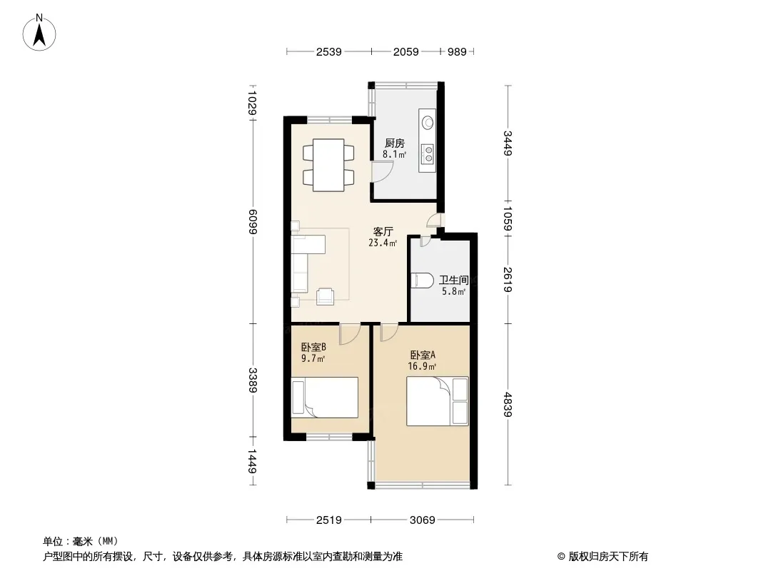 户型齐全,主打户型方正,明卫,明厨,双卧朝南,主卧朝南二居