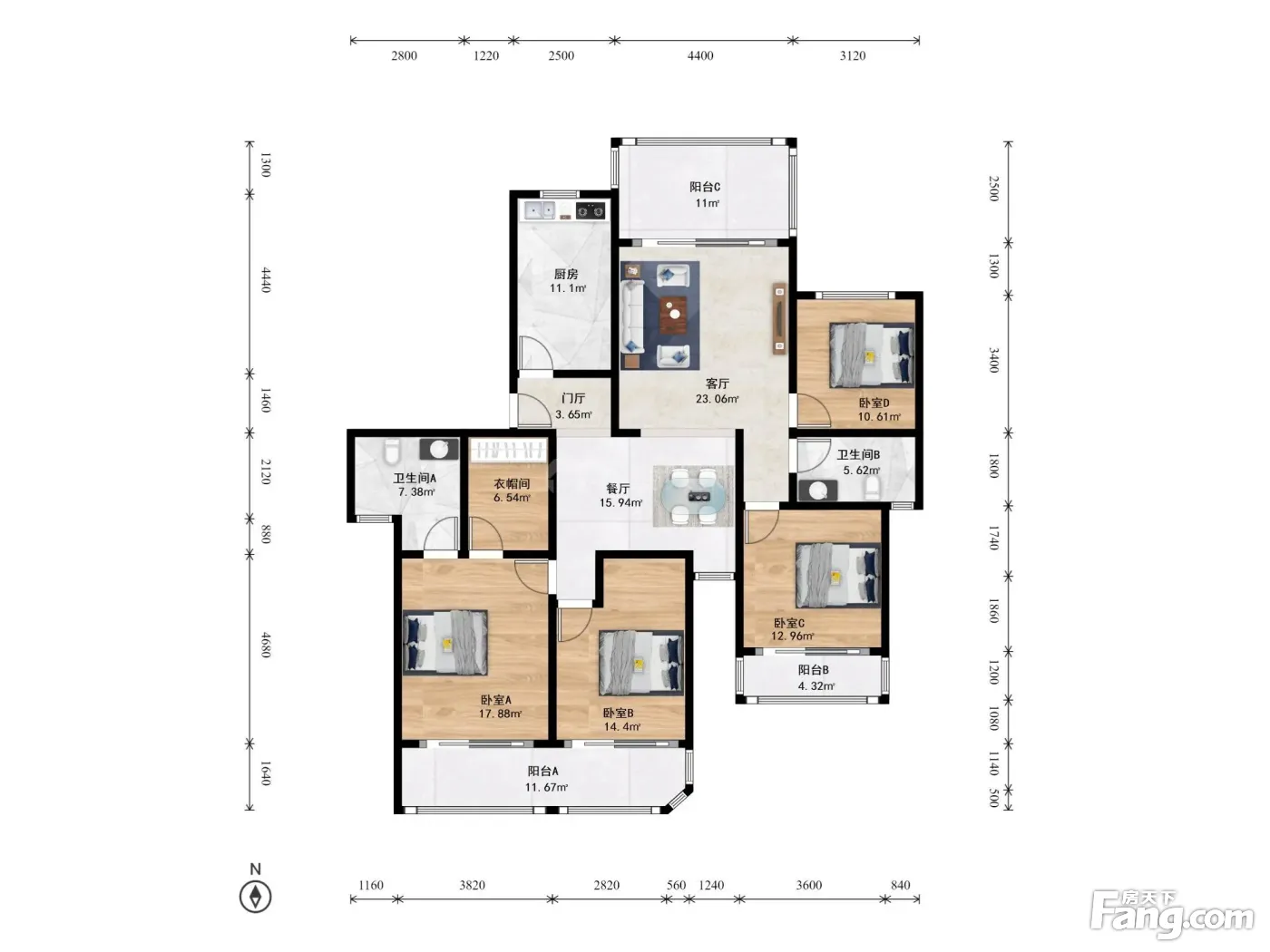 户型齐全,主打户型方正,明厨,明卫,独立衣帽间,客厅朝南四居