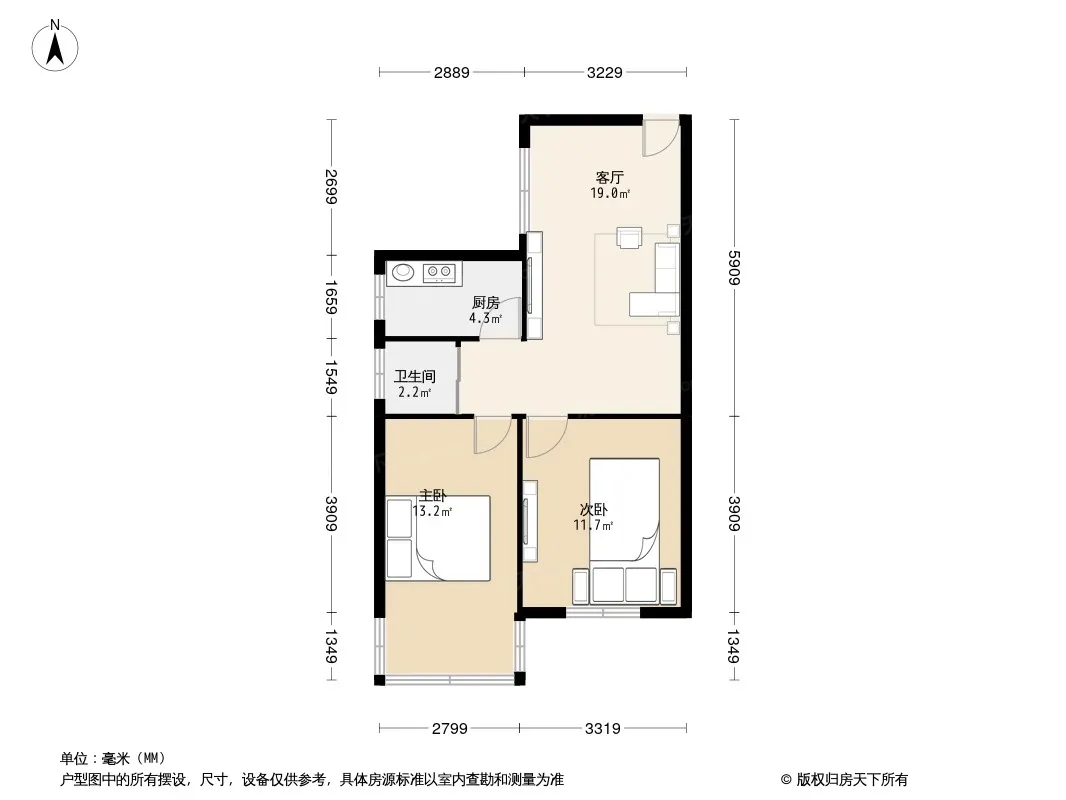 户型齐全,主打户型方正,明卫,明厨,客厅朝南,主卧朝南二居