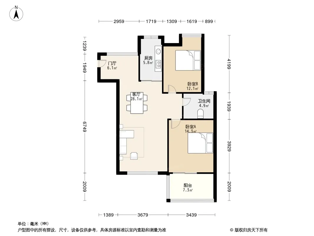 户型齐全,主打户型方正,明卫,明厨,主卧朝南二居
