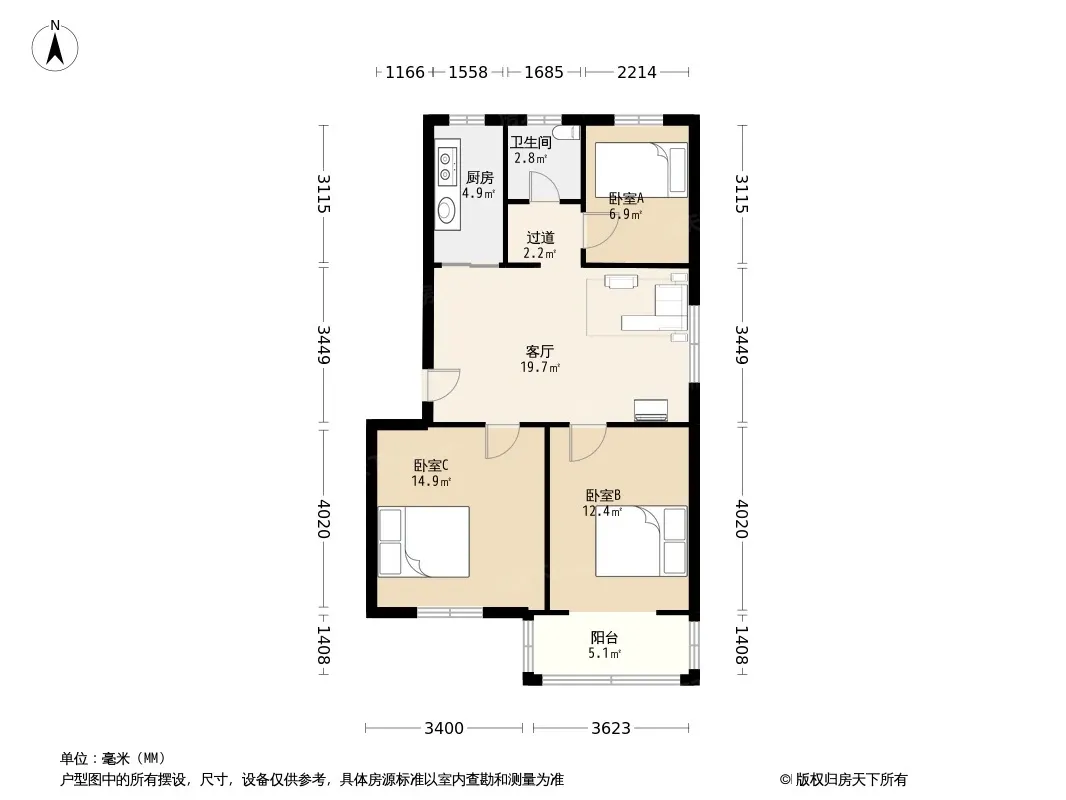 户型齐全,主打户型方正,明卫,明厨,客厅朝南,主卧朝南三居