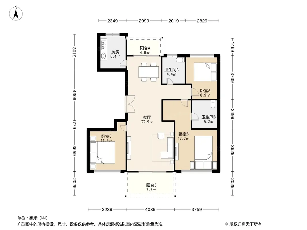 户型齐全,主打户型方正,明厨,客厅朝南,主卧朝南三居