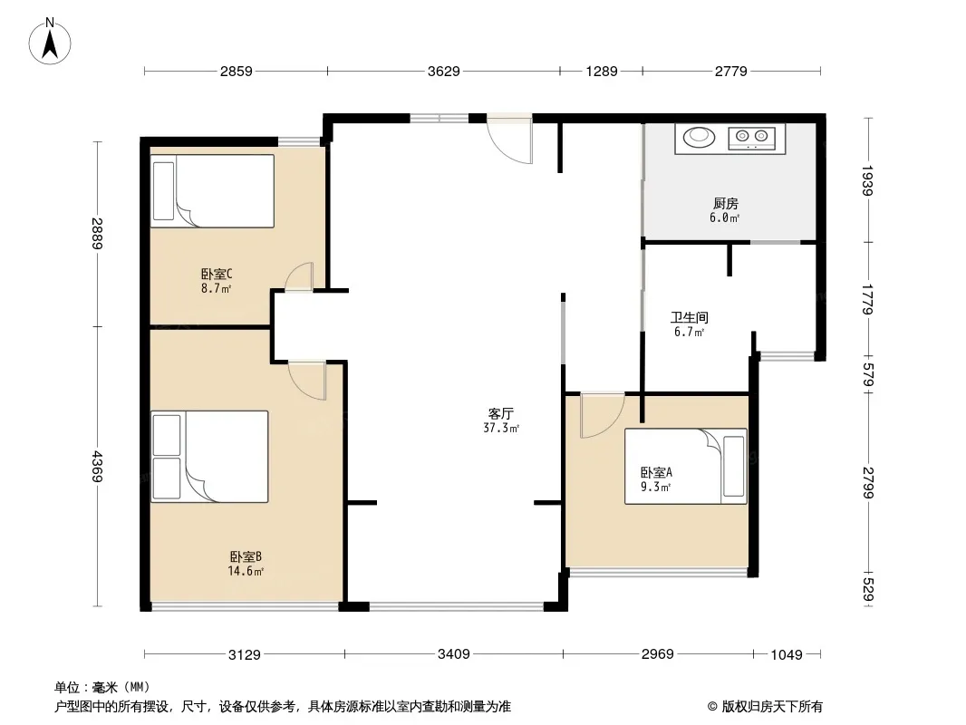 户型齐全,主打南北通透,全明格局,客厅朝南,卧室朝南,主卧带卫三居