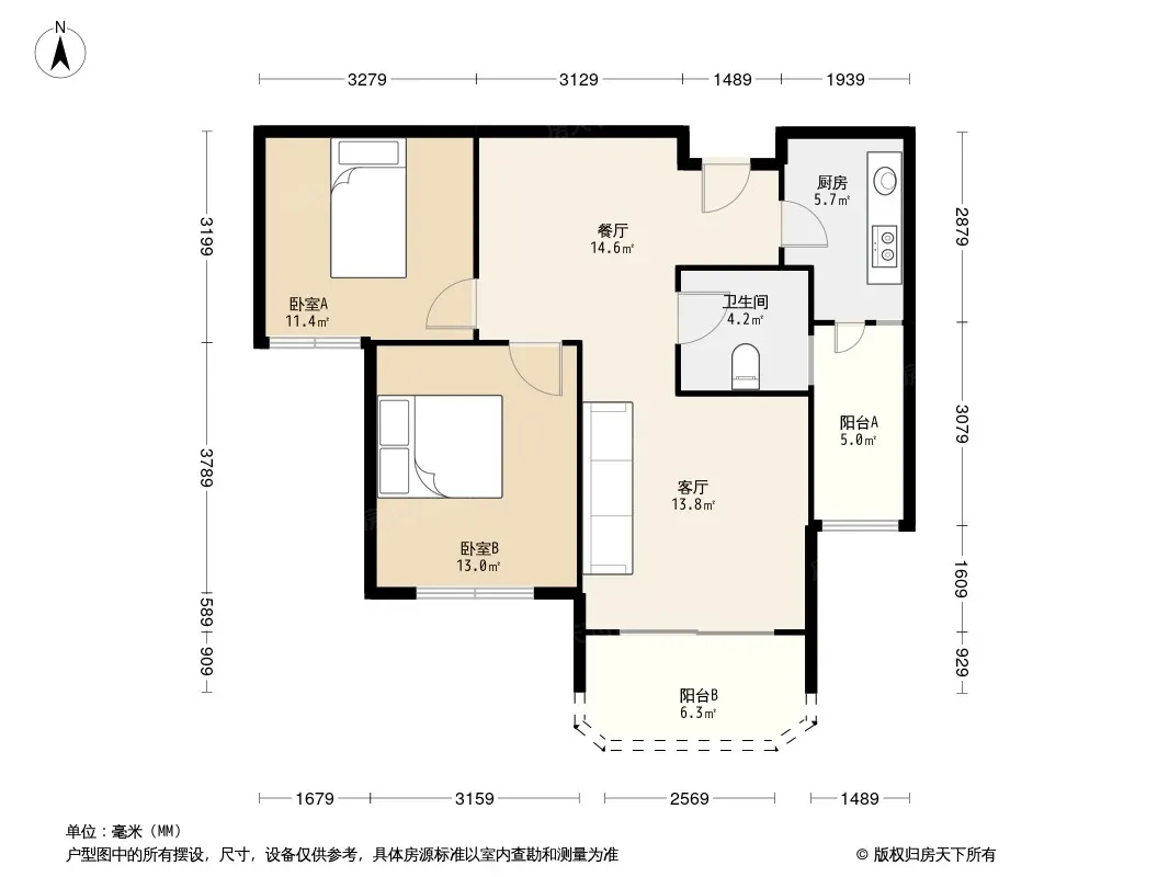 户型齐全,主打户型方正,明厨,双卧朝南二居