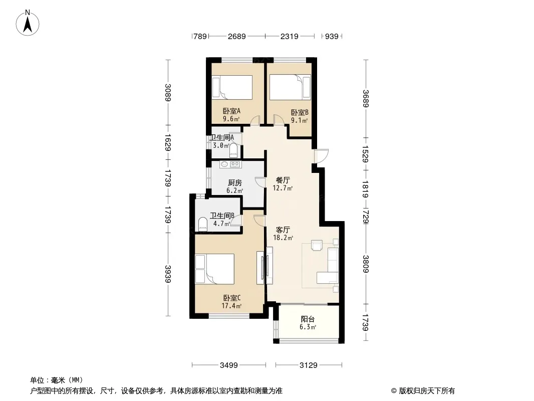 户型齐全,主打户型方正,明厨,明卫,主卧朝南三居
