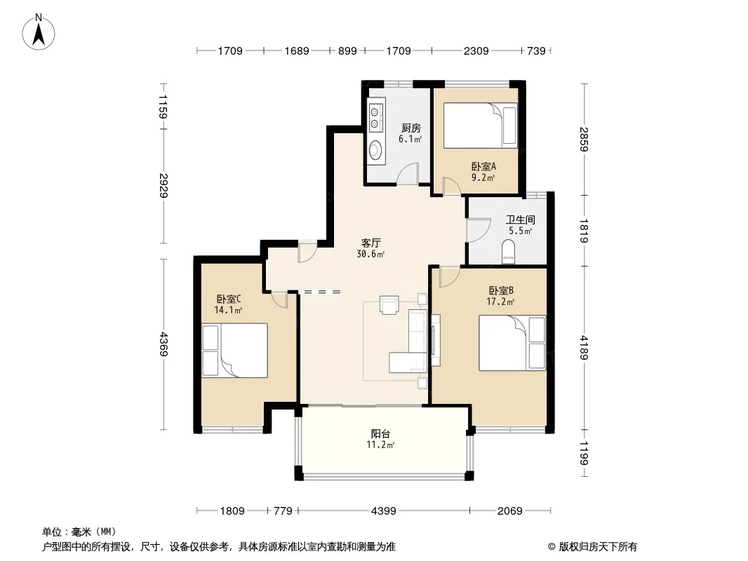 户型齐全,主打户型方正,明卫,明厨,客厅朝南,全明格局三居