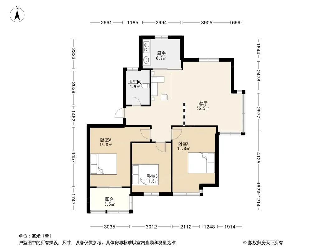 多蓝水岸听涛苑 3室2厅 南 北