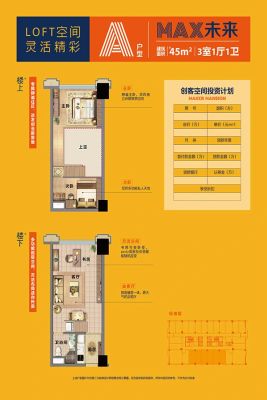创客空间户型主要有40平-40平的南北通透,动静分离的二居 、45平-45平的南北通透,动静分离的三居 。