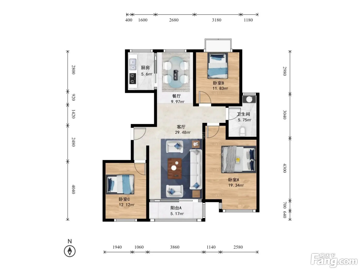 户型齐全,主打客厅朝南三居