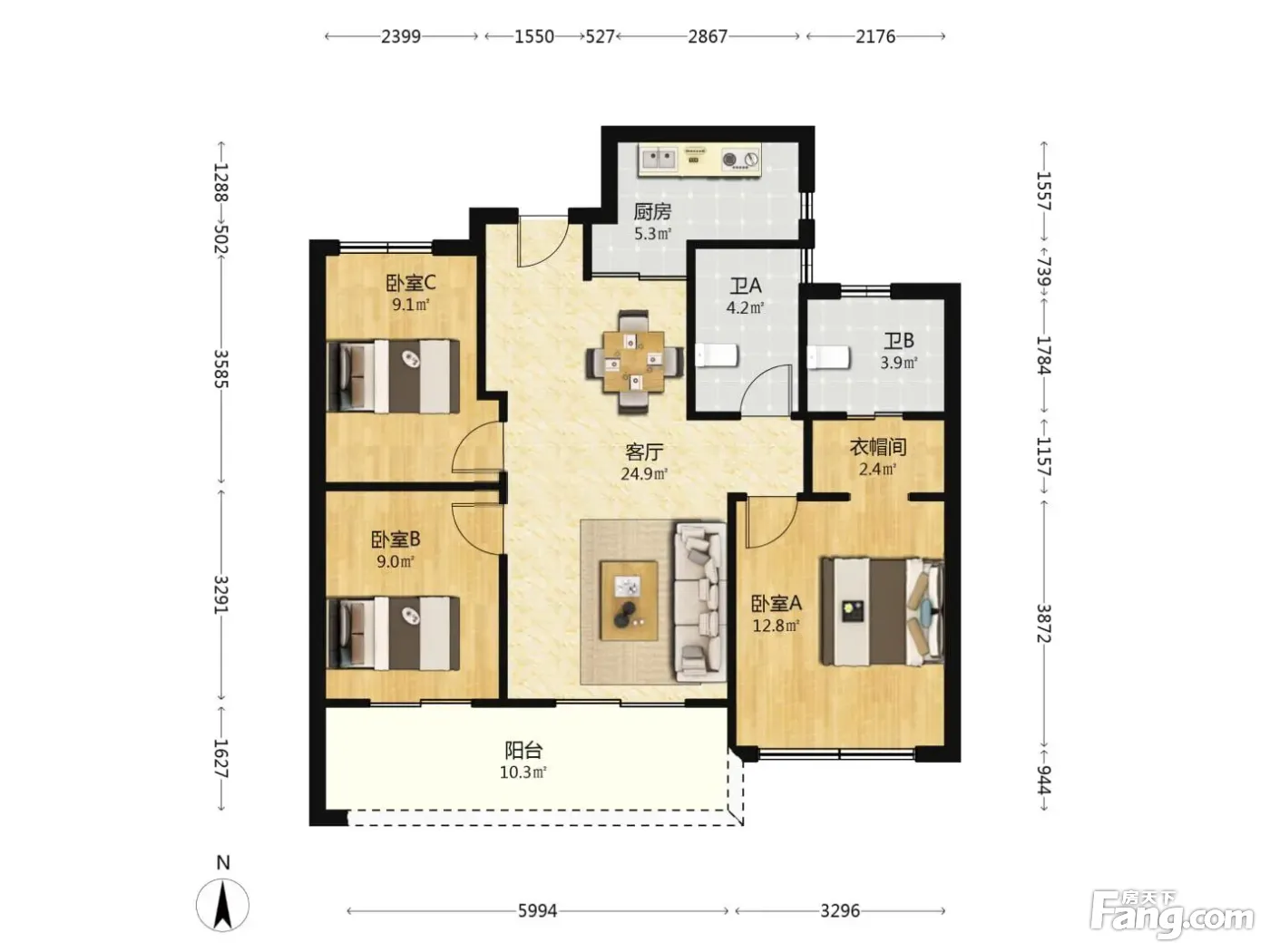 户型齐全,主打户型方正,独立衣帽间,明卫,明厨,主卧朝南三居