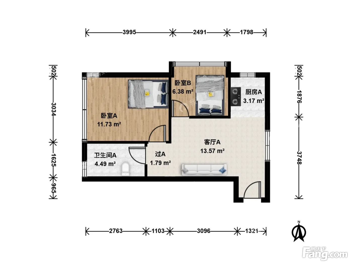 户型齐全,主打户型方正,明卫,明厨,客厅朝南,主卧朝南二居