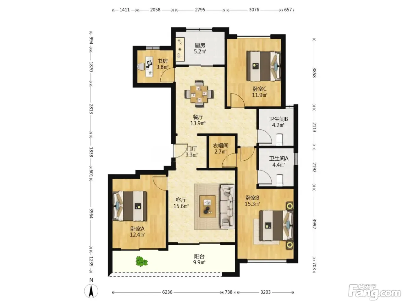 户型齐全,主打户型方正,明卫,明厨,客厅朝南,主卧朝南三居