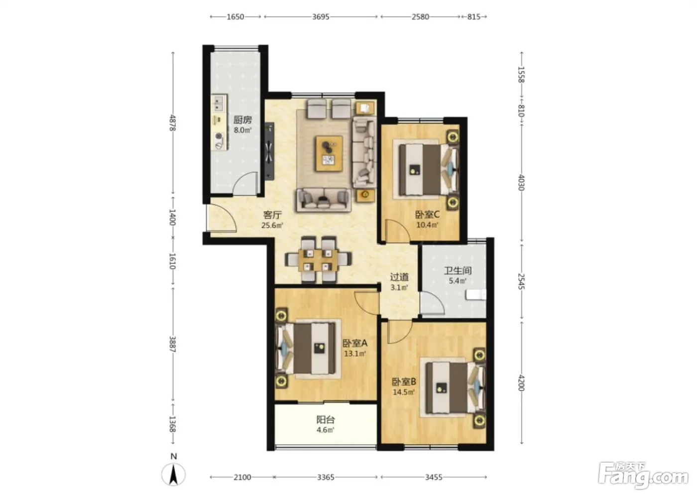 户型齐全,主打南北通透,主卧带卫,厨卫不对门,户型方正,主卧朝南,干湿分离,双阳台,餐客分离三居