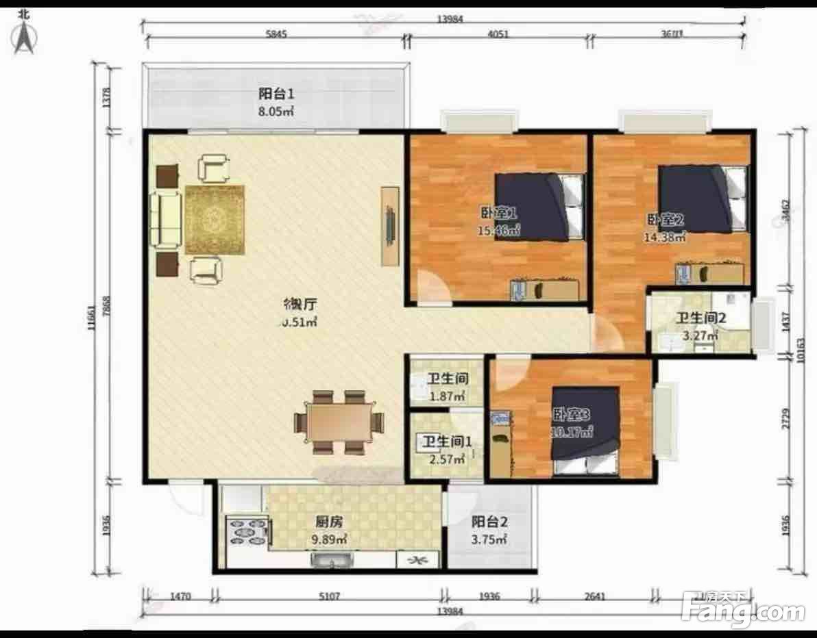 户型方正,通风采光好,南北对流,房间一次排开