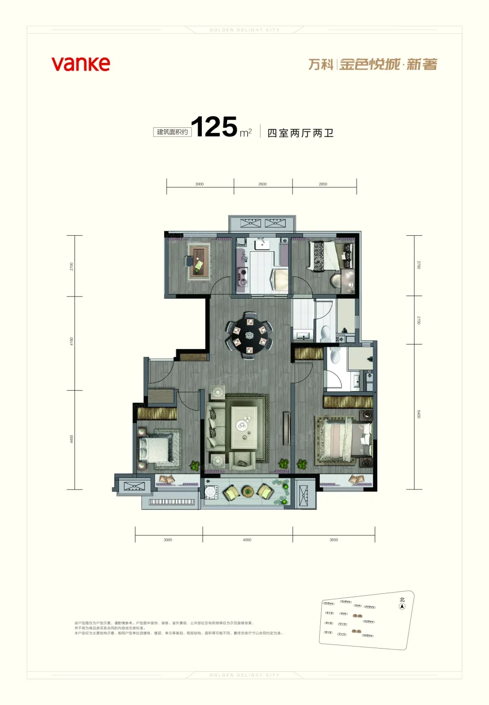 万科金色悦城新著户型主要有95平-105平的全明格局,户型方正的三居 、125平-125平的南北通透,全明格局,户型方正,客厅朝南,主卧带卫,双卧朝南,U型厨房,大面宽阳台的四居 。