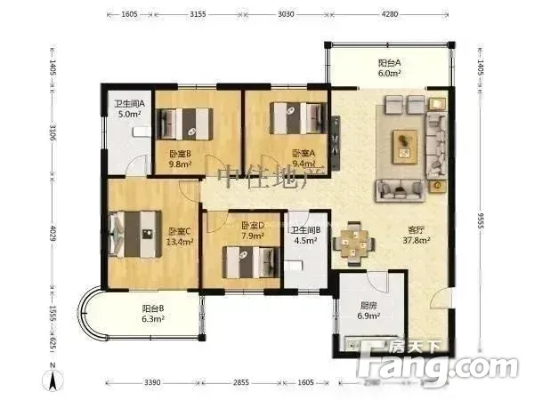 户型齐全,主打明厨,明卫,客厅朝南四居