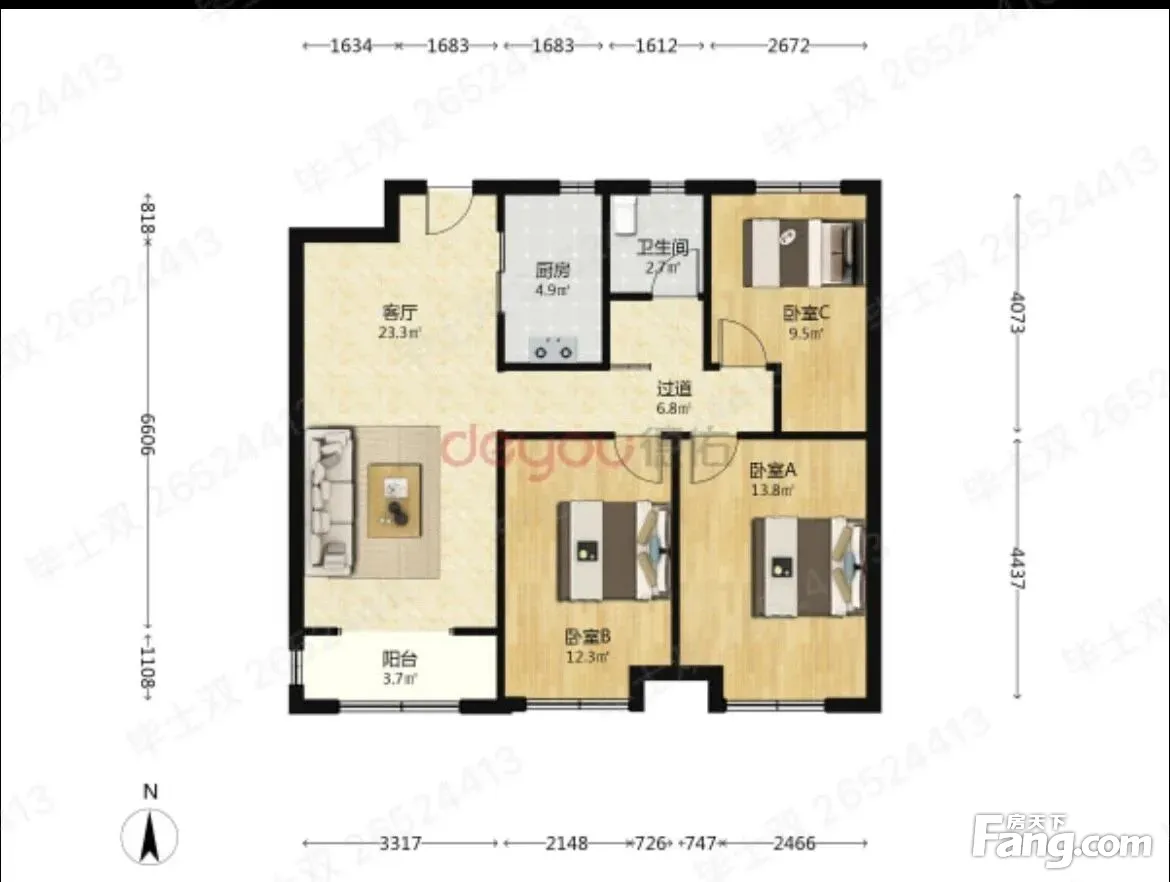 户型齐全,主打南北通透,客厅朝南,双阳台三居