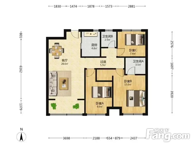 户型齐全,主打户型方正,明厨,明卫,客厅朝南三居