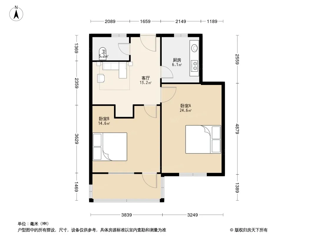 户型齐全,主打明卫,明厨,客厅朝南,双阳台二居