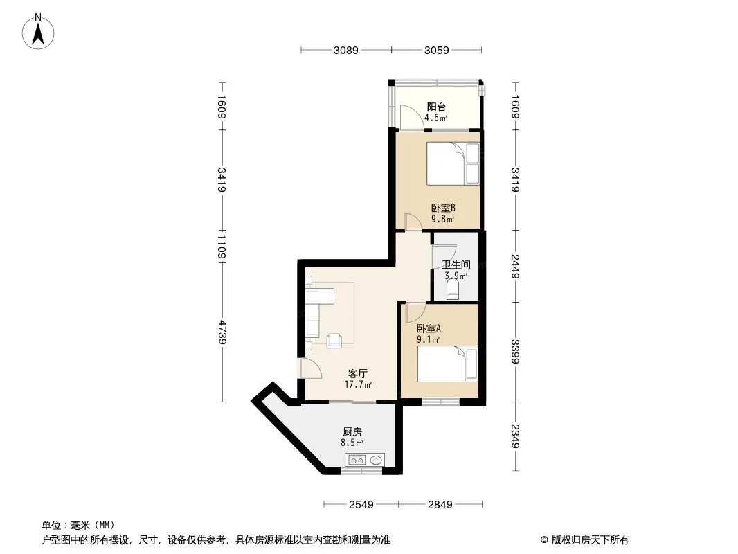 户型齐全,主打户型方正,明厨,主卧朝南二居