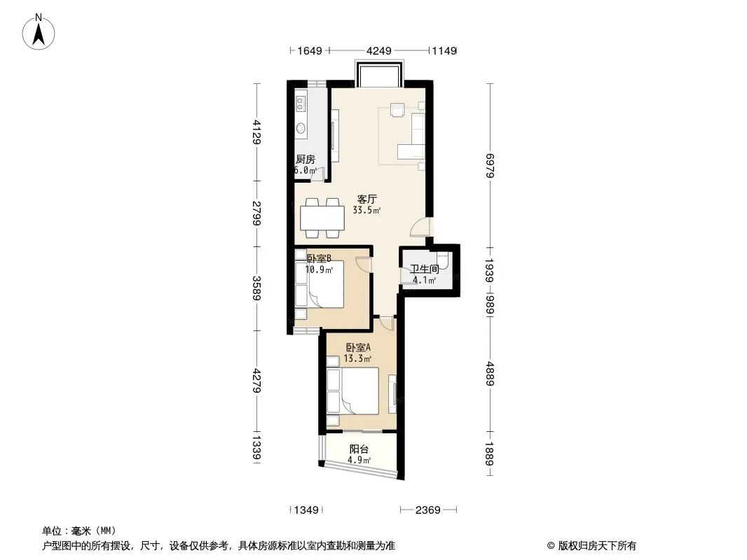 户型齐全,主打明厨,客厅朝南,主卧朝南二居