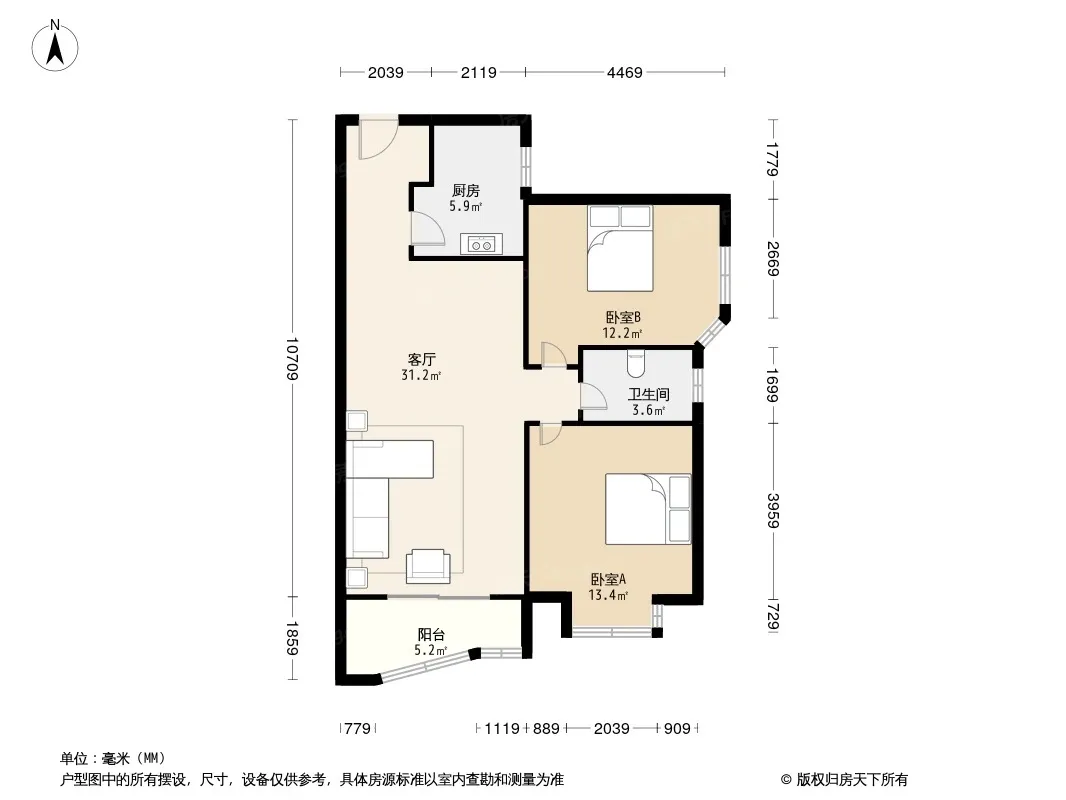 户型齐全,主打明厨,客厅朝南,主卧朝南二居