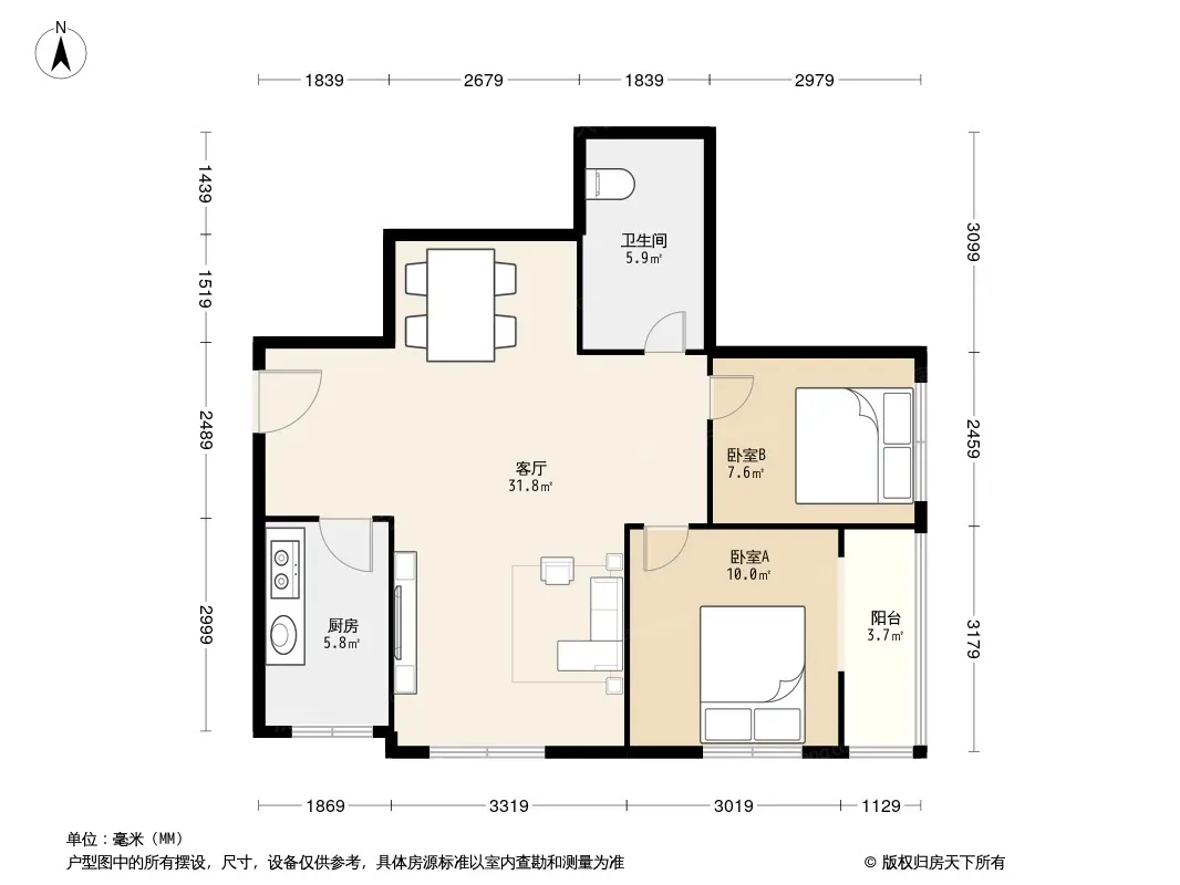 户型齐全,主打明厨,客厅朝南,主卧朝南二居